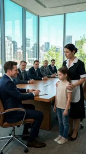 “Neem ons niet kwalijk, meneer Matthews,” fluisterde Martha, met gebogen hoofd zoals haar was geleerd. ‘Ik wist niet dat u in een vergadering zat. Mijn dochter moest vandaag mee, omdat ik geen oppas had. We kunnen later terugkomen als het u beter uitkomt.’