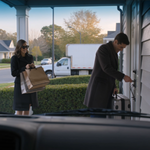 De sleutel wilde niet draaien. Mijn zoon Daniel stond op de veranda van mijn huis, glimlachend na zijn lange reis door Europa, met één hand een chique koffer en de andere hand de zilveren sleutel steeds weer omdraaiend. Zijn vrouw Melissa stond naast hem met een donkere zonnebril op, boodschappentassen vasthoudend en lachend alsof het een klein vergissing was. Toen duwde Daniel harder. De sleutel zat vast. Hij fronste, trok hem eruit en staarde naar het slot alsof de deur hem had verraden. Maar de deur had hem niet verraden. Ik had het gedaan. En terwijl ik vanaf de overkant van de straat, in een geparkeerde verhuiswagen, toekeek, bonkte één koude gedachte in mijn borst. Na alles wat ik had gehoord, na de woorden die mijn hart hadden gebroken, hoe kon ik ze weer in mijn leven laten komen alsof er niets was gebeurd?