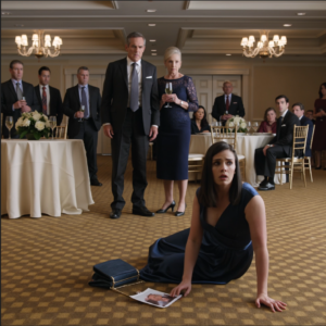 Op het afscheidsfeest van mijn vader duwde hij me op de grond en zei, voor de ogen van 130 gasten: “Die stoel is voor mijn echte dochter.” Ik wilde net mijn tas pakken om te vertrekken toen mijn man opstond, naar hem wees aan de andere kant van de zaal en de vraag stelde waardoor mijn stiefmoeder even haar adem inhield: “Wanneer heb je voor het laatst op je telefoon gekeken?”