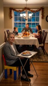 Ik bracht de taart mee, glimlachte naar mijn kleinkinderen en liep het Thanksgiving-diner binnen alsof ik er nog steeds thuishoorde. Toen wees mijn zoon naar een klein kinderstoeltje in de hoek en zei: ‘Mam, dit is beter voor iedereen.’ Ik zei niets.