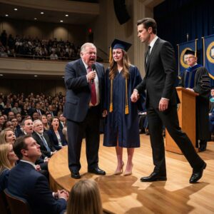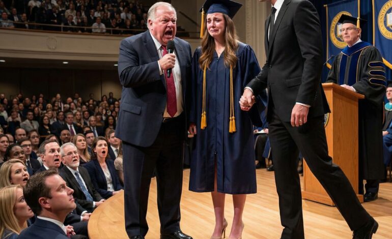 Mijn oom vernederde me tijdens de diploma-uitreiking omdat ik wc’s schoonmaakte om mijn studie te betalen – toen kondigde de decaan een speciale gast aan, en alles veranderde.