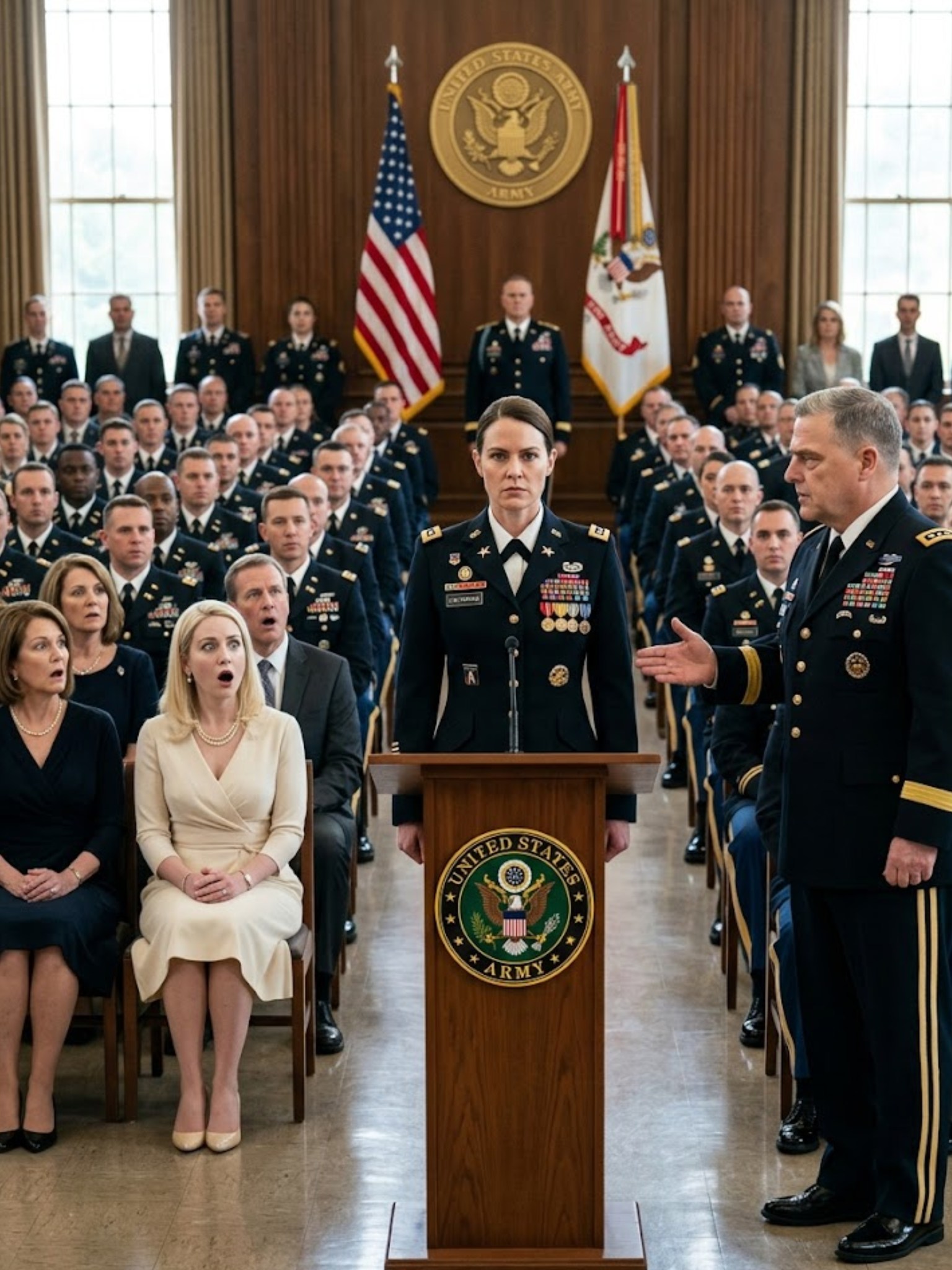 Ik stond daar gewoon, mijn hand lichtjes rustend op de rugleuning van mijn stoel, mijn dochters naast me – klein, stil, kijkend.