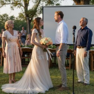 ‘We hebben iedereen al verteld dat je onze uitnodiging hebt ingetrokken,’ zei mijn moeder zes weken voor mijn bruiloft. Vervolgens annuleerde ze mijn aanbetalingen, vertelde ze onze familie dat ik labiel was en kwam ze lachend als een slachtoffer mijn receptie binnen. Maar toen mijn man de microfoon pakte, om de projector vroeg en zei: ‘Ik ben je zoon niet, Harold, en ik ben nog niet klaar,’ viel de hele boerderij stil.