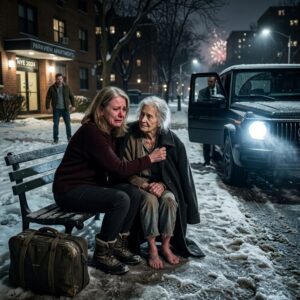 Mijn zoon gooide me op oudejaarsavond het huis uit, en uren later zat ik te bevriezen op een parkbankje toen een oude vrouw op blote voeten alles veranderde.