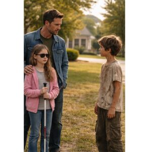 Daniel Carter hield de hand van zijn dochter stevig vast terwijl ze over de stoep liepen. Zijn greep was stevig, beschermend – bijna wanhopig. Naast hem liep de negenjarige Emily voorzichtig, terwijl ze met een geoefend ritme met haar witte stok op de grond tikte. Haar donkere bril verborg haar ogen, maar niet de stille onschuld op haar gezicht.
