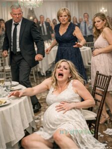 De muziek stopte. Gehijg golfde door de balzaal. Stoelen schoven naar achteren terwijl mensen opstonden, in een poging te zien wat er was gebeurd. Ik lag daar, verbijsterd, niet in staat om te bewegen, de angst overspoelde me terwijl ik probeerde te voelen of mijn baby nog bewoog. De stem van mijn moeder sneed door de chaos heen, scherp en gebiedend. “Het gaat goed met haar,” zei ze luid. “Iedereen mag blijven eten. Ze verloor gewoon haar evenwicht.”