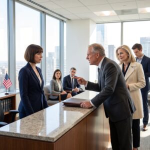 De oudere vrouw in de wachtruimte stond als versteend, met haar handen stevig om een map geklemd. De man bij het raam keek langzaam op, zijn ogen tot spleetjes geklemd. Mia’s vingers klemden zich vast aan haar notitieblok.